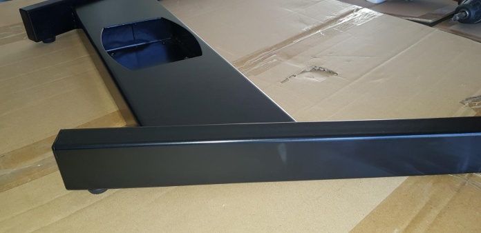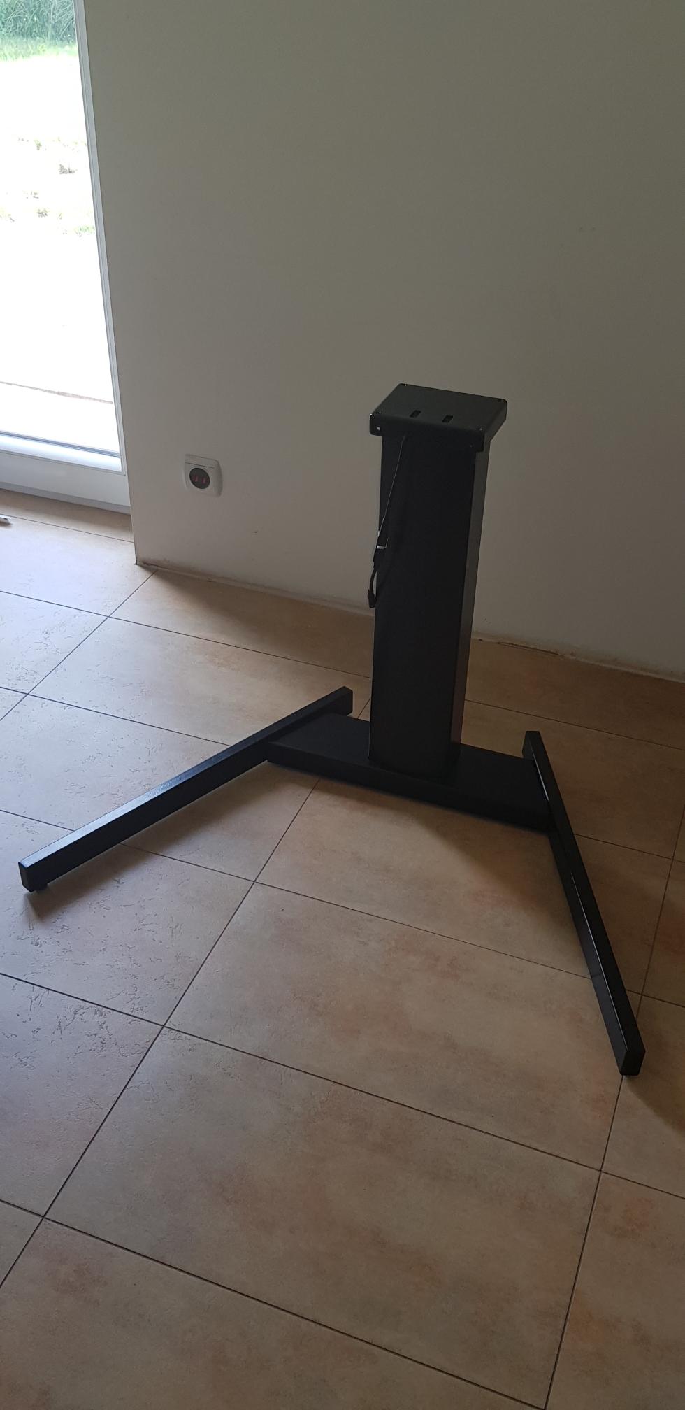 Stelaż z regulacją wysokości w stanie dobrym. Pomimo drobnych uszkodzeń wizualnych (zarysowania, otarcia, odpryski lakieru widoczne na zdjęciach), konstrukcja jest w pełni sprawna technicznie.