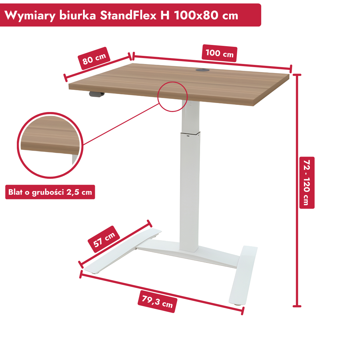 Specyfikacja techniczna małe biurko regulowane StandFlex H o wymiarach 100x80 cm
