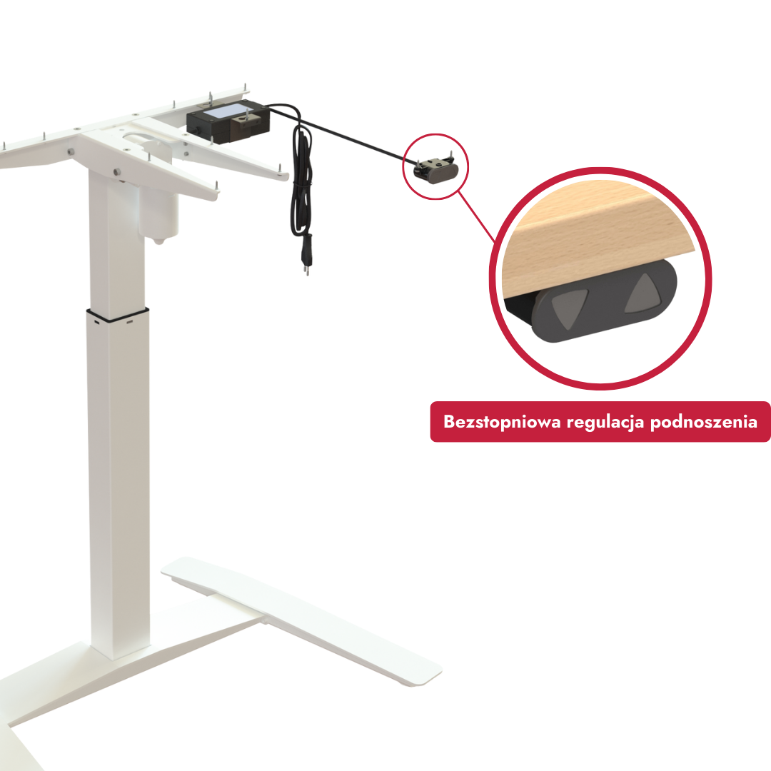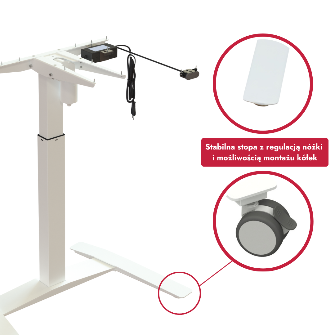 Noga elektryczna do biurka wykonana jest ze stali malowanej proszkowo na kolor biały (RAL 9016), co zapewnia trwałość, ale także estetyczny wygląd.