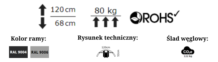 Cały stelaż elektryczny do biurka wykonany jest ze stali malowanej proszkowo na kolor srebrny lub czarny. Elementy teleskopowe wykonane są w kolorze czarnym.